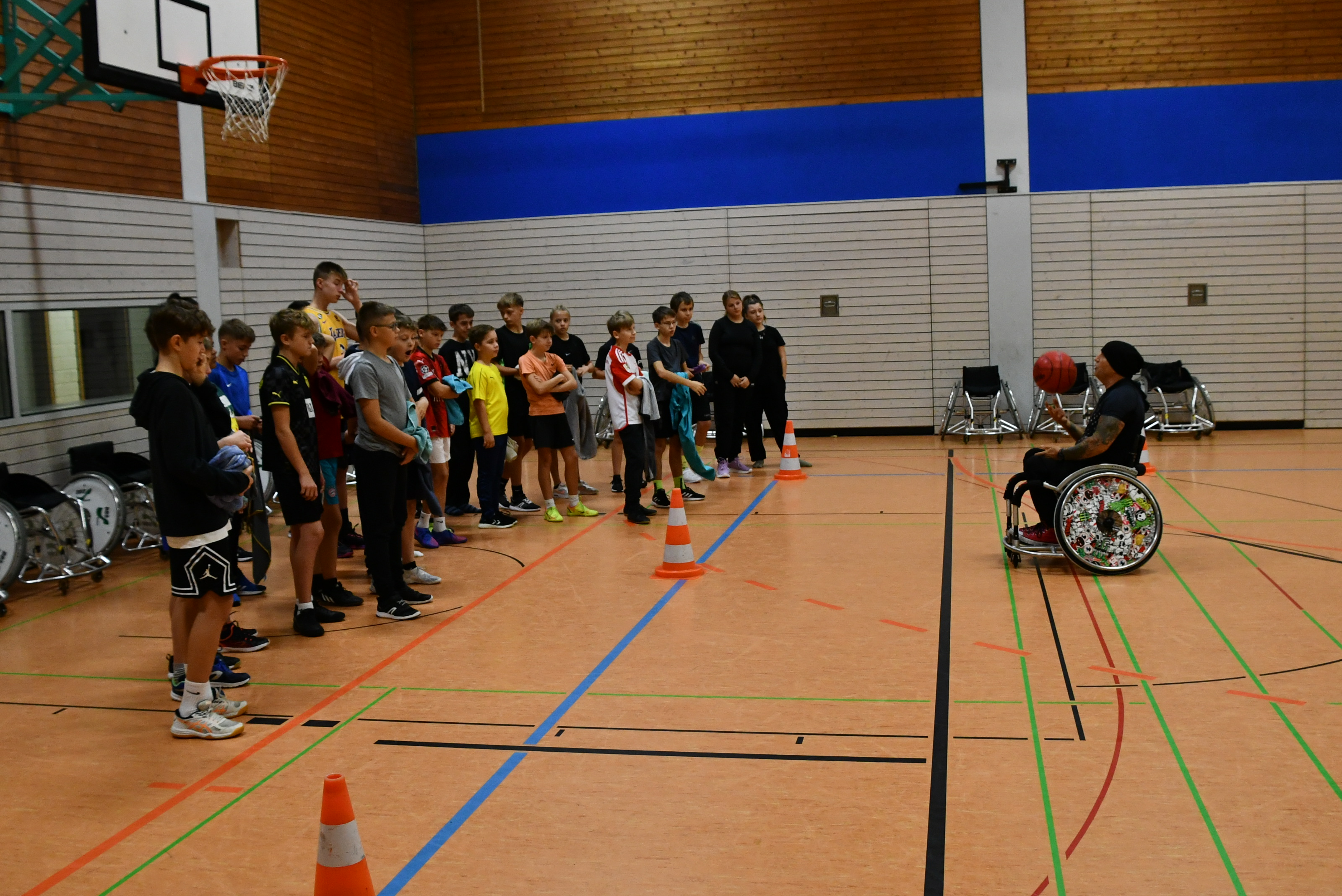 Das Fahren im Rollstuhl wurde nicht nur theoretisch vermittelt, sondern durch praxisnahe Übungen und Spiele erlernt. Auch das Korbwerfen, eine grundlegende Fertigkeit im Basketball, wurde aus der Perspektive des Rollstuhlfahrers geübt. Dies nicht nur als sportliche Herausforderung, sondern vor allem als bedeutendes Erlebnis, das das Bewusstsein dafür schärfte, dass Sport auch mit einer Behinderung problemlos möglich ist.