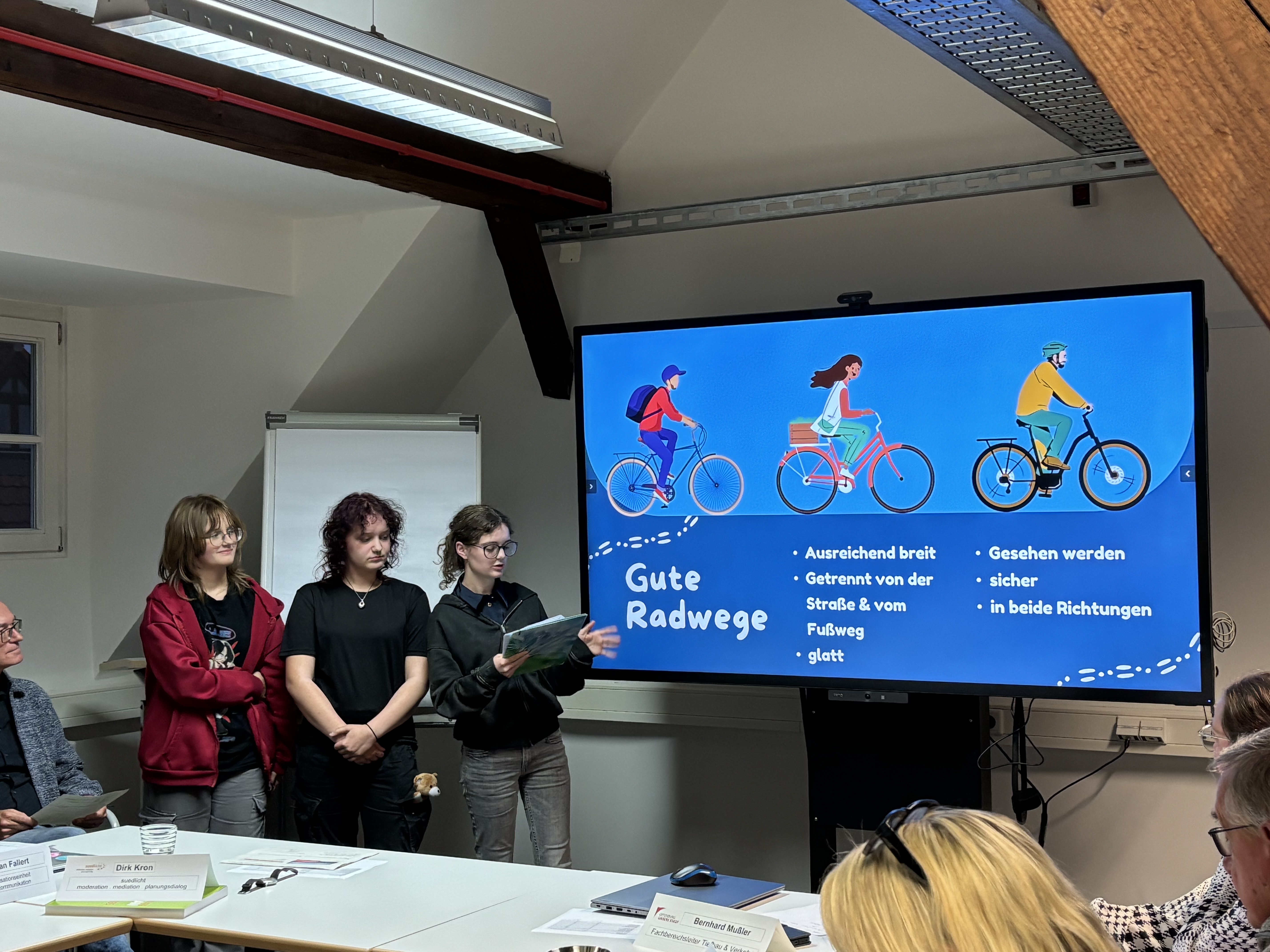 Drei unserer Schülerinnen durften dort die Ergebnisse des Verkehrsworkshops aus dem letzten Jugendbeteiligungsformat "Sags laut!" vorstellen. Den Workshop hatten sie gemeinsam mit Herrn Pastorini moderiert. Thema war: Was ist für Jugendliche wichtig, wenn sie zu Fuß, mit dem Rad oder dem Bus in Offenburg unterwegs sind?