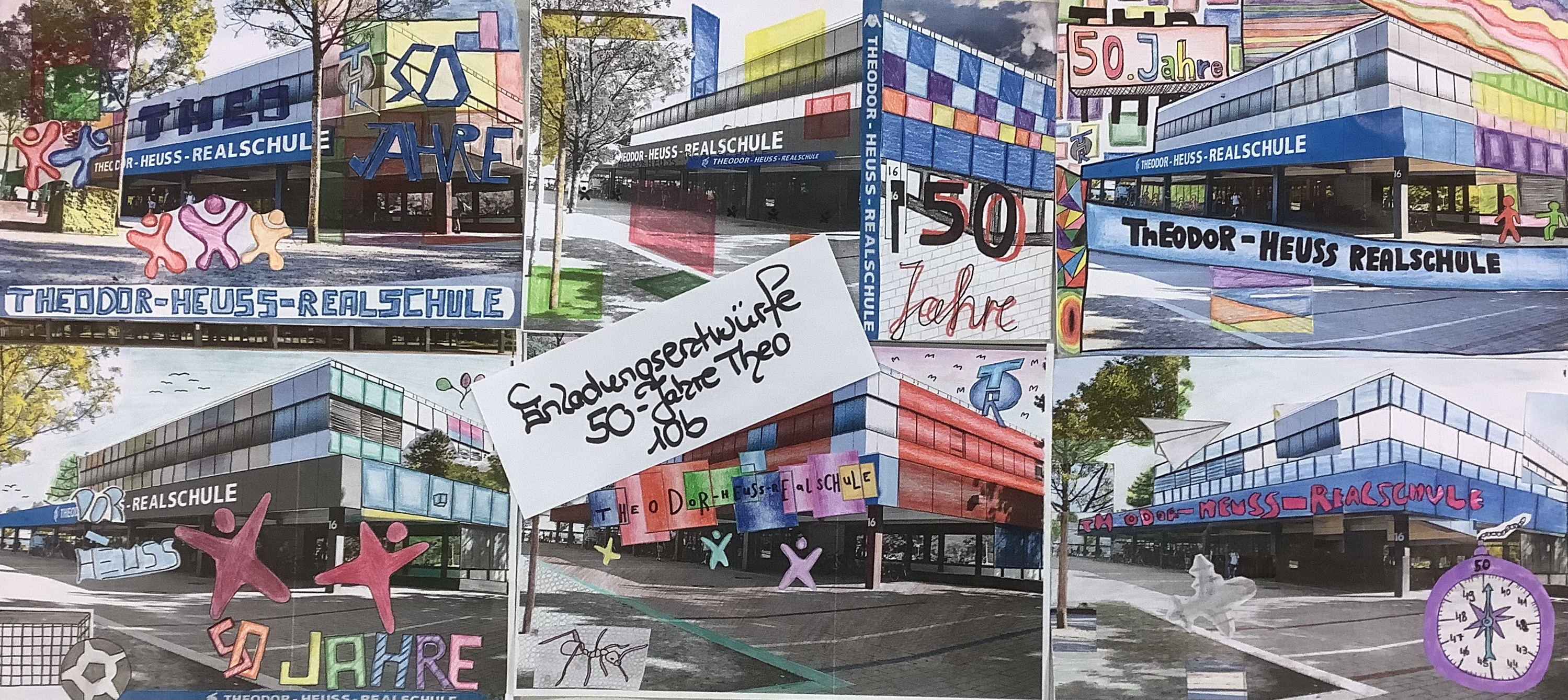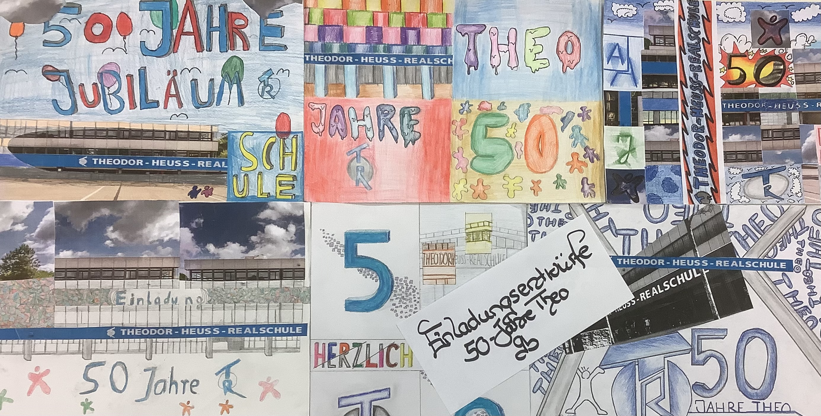Die Klassen 9b und 10b haben mit Kunstlehrerin Birgit Sartor für die 50-Jahrfeier der Theo Einladungskarten entworfen.