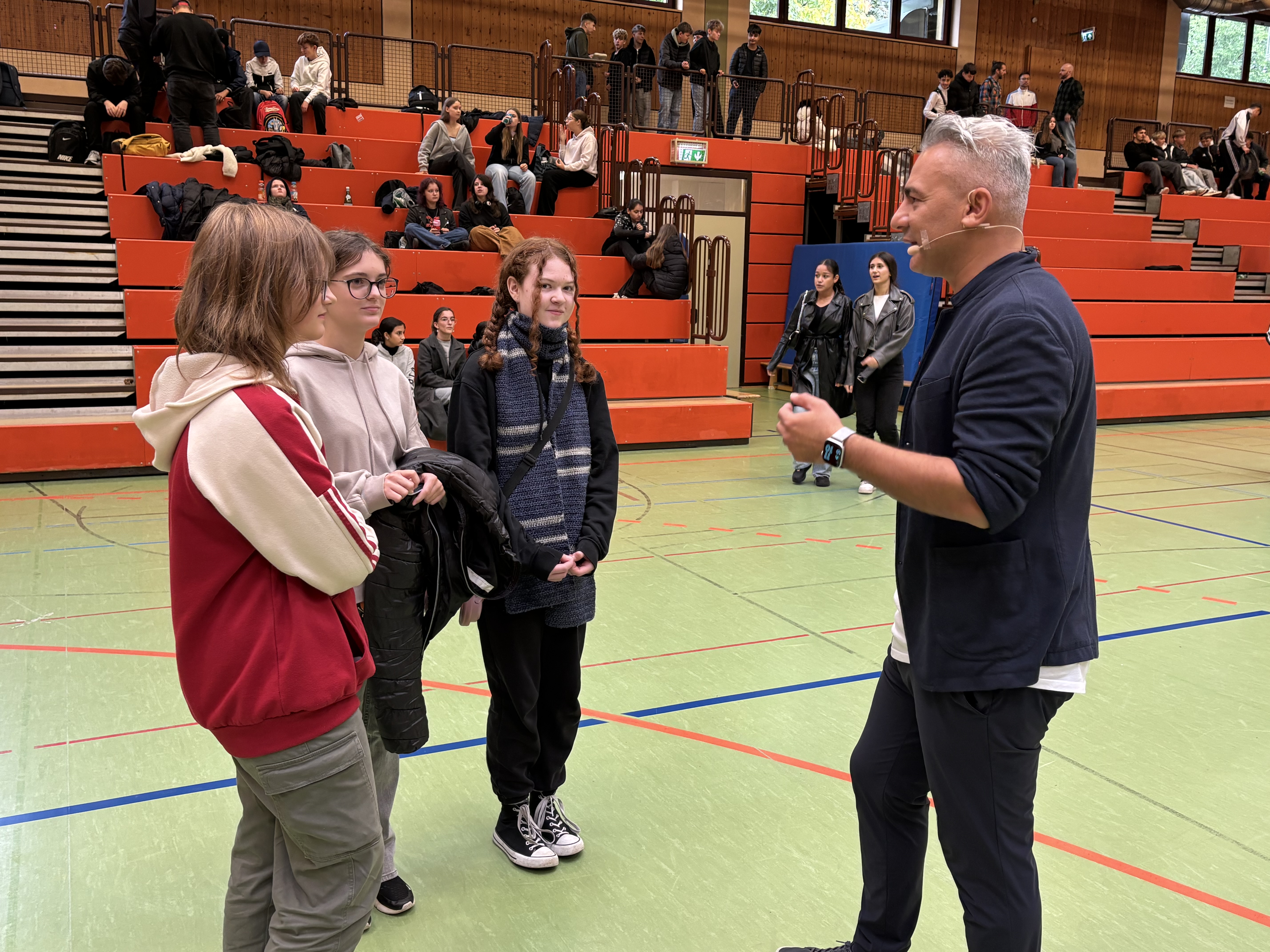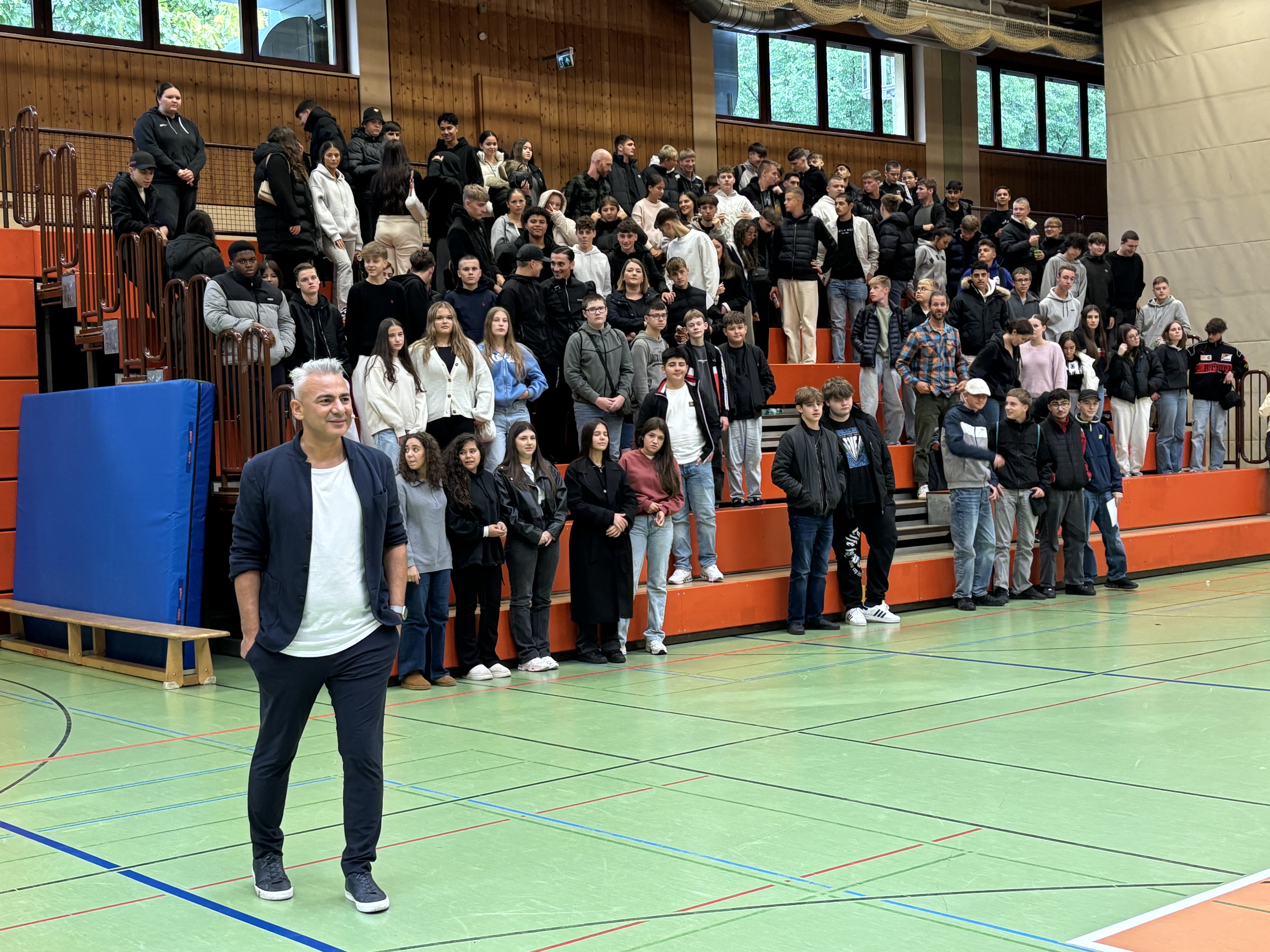 Zu Beginn seines Programms brachte Citir die Jugendlichen mit seinen Gags zum Lachen. Mit viel Humor hielt er ihnen den Spiegel vor – etwa beim Thema Jogginghose in der Schule. Auch Stereotype verschiedener Herkunftsländer der Schüler*innen beleuchtete er augenzwinkernd. Durch seine authentische und jugendnahe Sprache gelang es Citir, schnell eine Verbindung zu seinem Publikum aufzubauen.