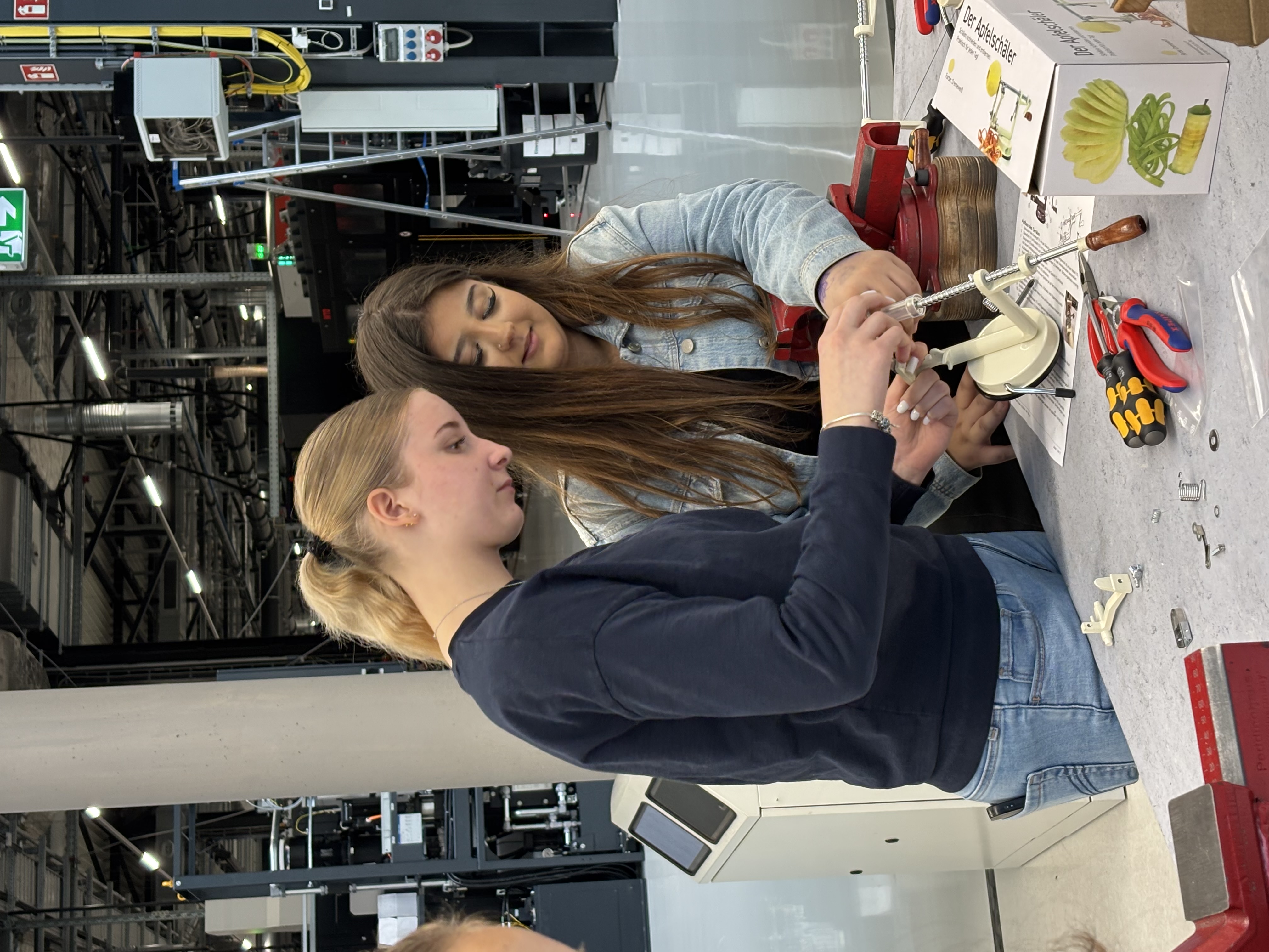 Nach einer Betriebsführung und einem gemeinsamen Mittagessen im WTO-Bistro durften die Schülerinnen loslegen: Jede von Ihnen bauten mit Unterstützung der Azubis ihre eigene Apfelschälmaschine 🍏🔧. Dieser Tag ist ein Baustein unseres Profils „Mädchen fit in Wissenschaft und Technik“.