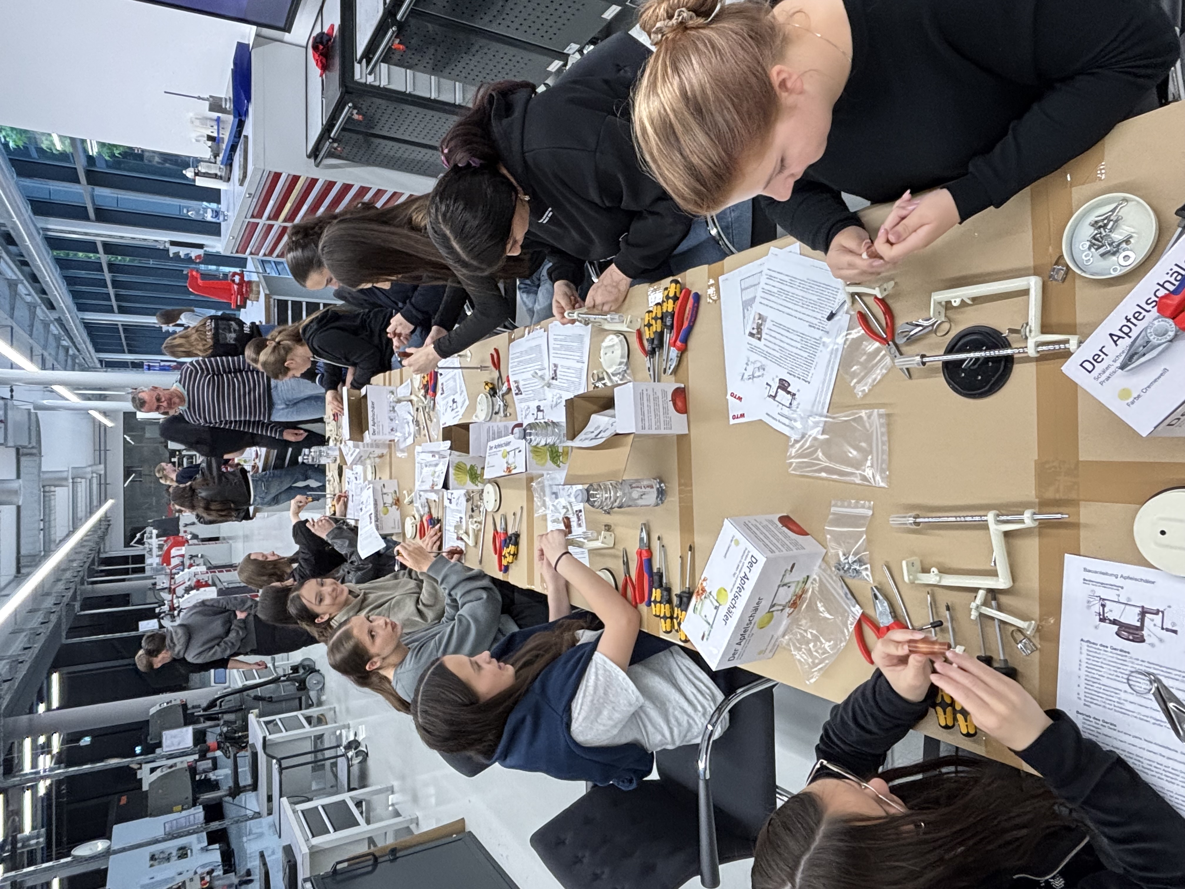 Nach einer Betriebsführung und einem gemeinsamen Mittagessen im WTO-Bistro durften die Schülerinnen loslegen: Jede von Ihnen bauten mit Unterstützung der Azubis ihre eigene Apfelschälmaschine 🍏🔧. Dieser Tag ist ein Baustein unseres Profils „Mädchen fit in Wissenschaft und Technik“.